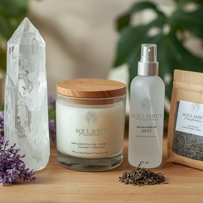 Each Soul Shift kit blends radiant crystals, botanical aromatherapy mist, handcrafted candles, and organic artisan tea— inviting presence, reflection, and transformation.